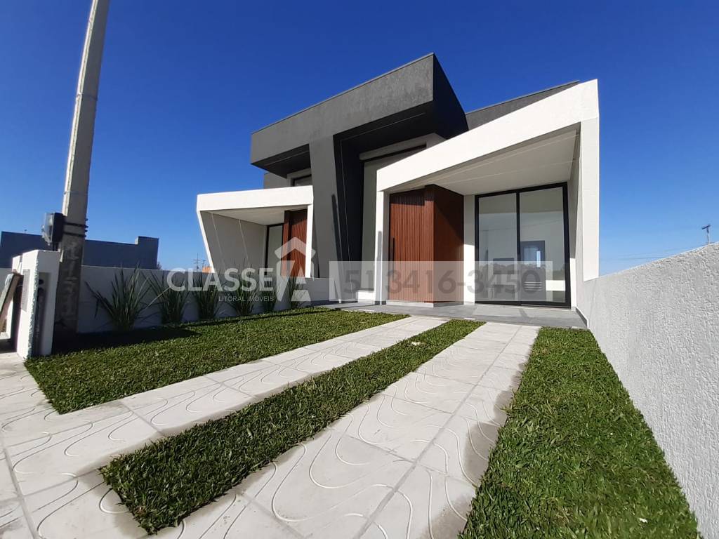 Casa pronta de 03 dormitórios (suíte), banho social, estar e jantar integrados com cozinha americana, lavanderia separada, churrasqueira, aberturas dos dormitórios automatizadas, espera para Split, pisos e azulejos em porcelanato, tudo em fino acabamento, bem localizada na Nova Guarani, frente Norte.