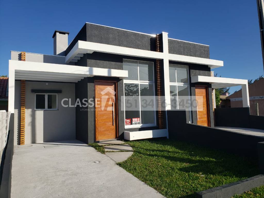 Casa nova geminada no Bairro Zona Norte em Capão da Canoa. São 02 dormitórios suíte, banho social, living em 02 ambientes integrados com cozinha americana, área de serviço, pátio nos fundos e na frente. Aceita financiamento bancário